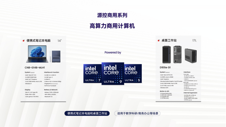 另外,源控商用业务推出了基于英特尔 酷睿 Ultra 5/7/9 处理器的高算力商用计算机,便携式笔记本电脑和桌面工作站可为教学科研和商务办公等场景提供坚实方案。以源控新一代桌面工作站为例,其搭载了英特尔 酷睿 Ultra第二代芯片,可选Ultra 5/7/9 处理器,内部采用榫卯结构,可进行模块快拆,超扩展架构以及抽拉式防尘网便于维护使用,支持四个内存插槽最高达128GB,可进行“双M.2 SSD+双3.5英寸 HDD”扩展,配合动态散热可为商务办公或专业设计带来更加便捷、高效的使用体验。