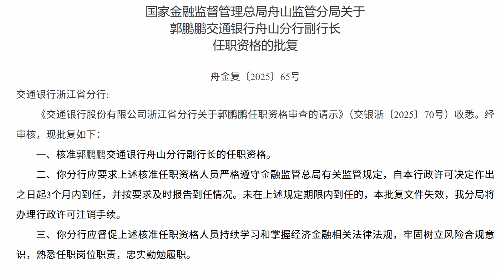12月26日,国家金融监督管理总局舟山监管分局发布关于郭鹏鹏交通银行舟山分行副行长任职资格的批复,核准郭鹏鹏交通银行舟山分行副行长的任职资格。